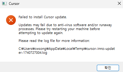 그러다 이번주 수요일쯤, 갑자기 오류 메세지가 뜨며 Cursor가 켜지지 않았다.