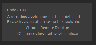 Code : 1002 화면 녹화 또는 캡쳐 프로그램이 감지되었습니다. 해당 프로그램을 종료하신 후 다시 시도해주시기 바랍니다. Chrome Remote Desktop ID : inomeogfingihgjfjlpeplalcfajhgai