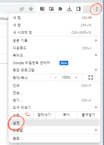 Chrome(크롬) 우측 상단에 메뉴를 클릭하여 설정을 누른다.