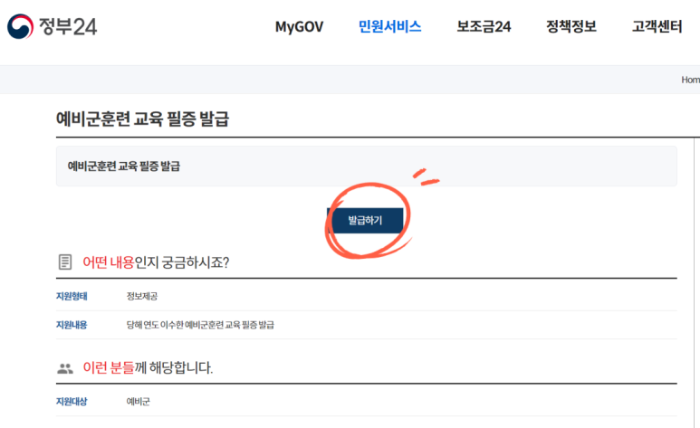 확인증으로 인정되는 예비군훈련 교육 필증은 정부24 홈페이지에서 무료로 온라인 발급이 가능하다.