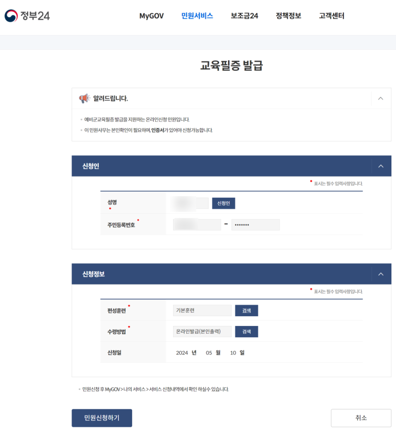 그리고 이름과 주민번호, 편성 훈련을 선택하고 민원신청하기를 누른다.