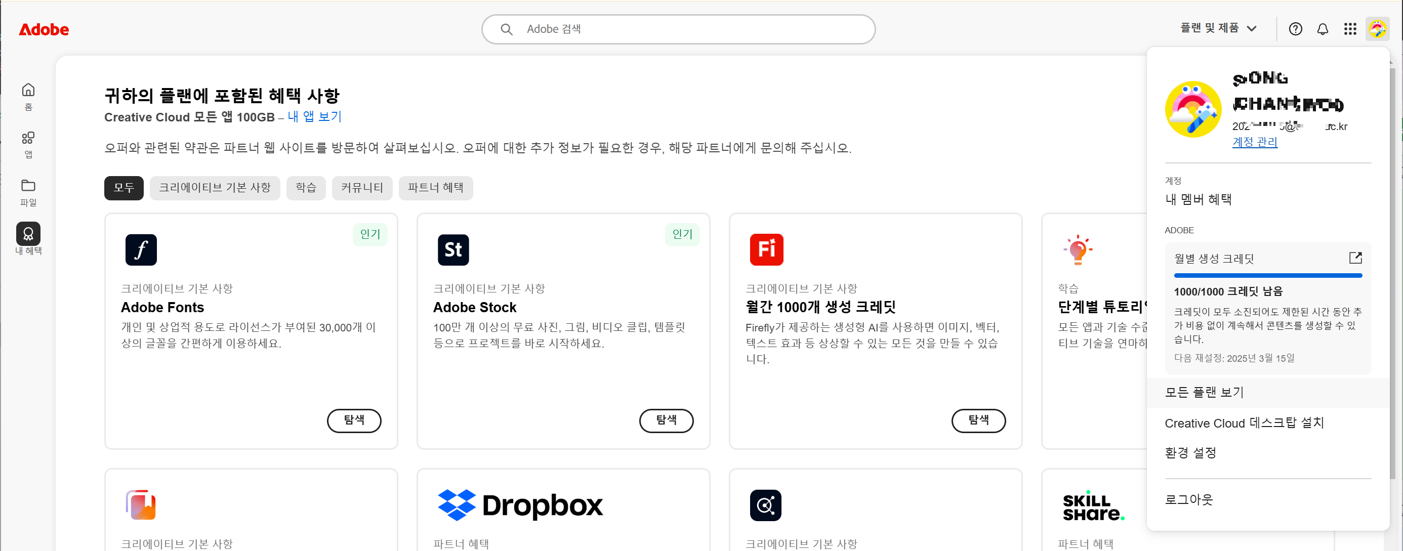 adobe에 로그인하고 오른쪽 상단에 프로필을 누른다.