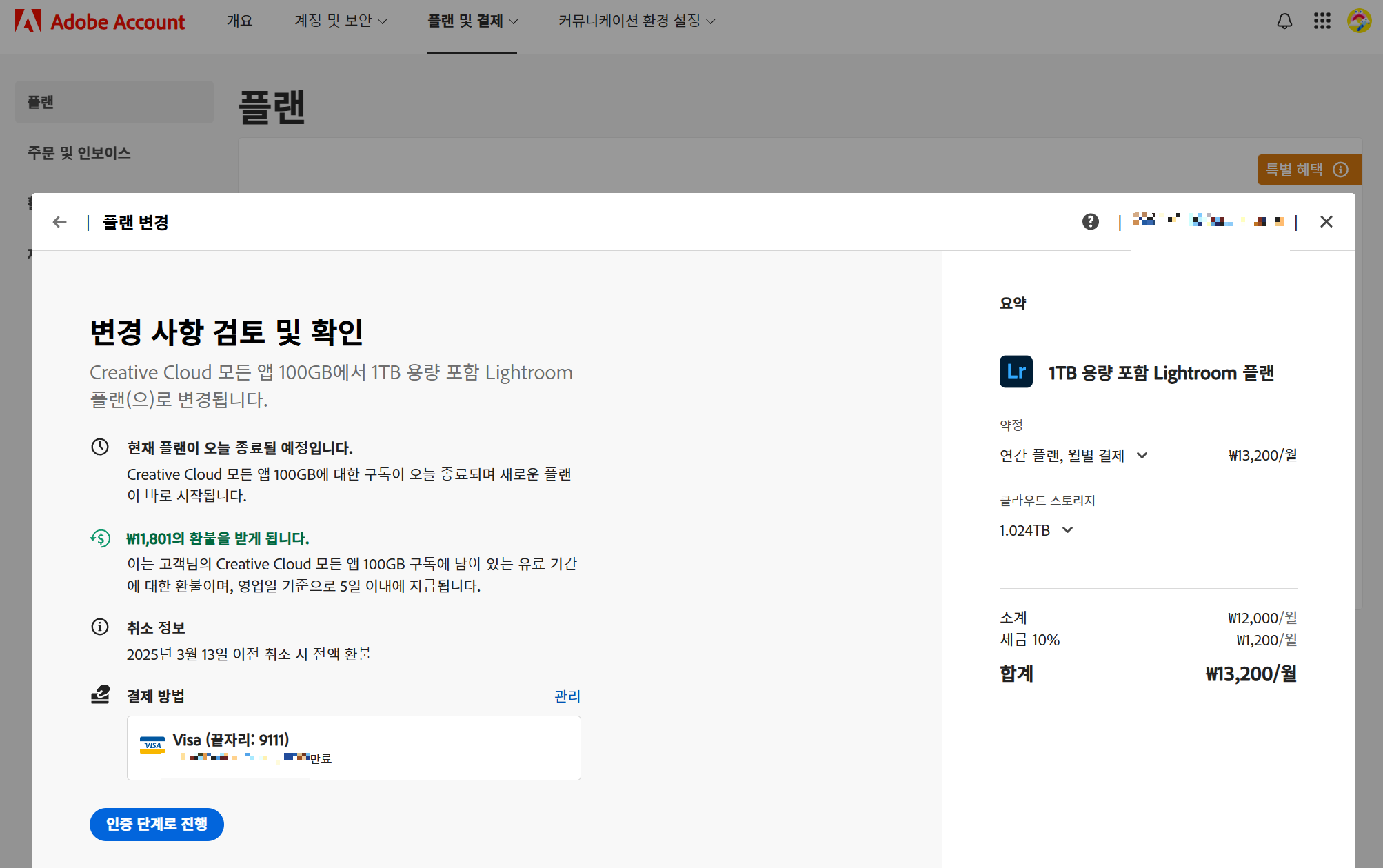 기존 어도비 요금제가 선택한 것보다 비싼거여서 부분 환불을 해준다.