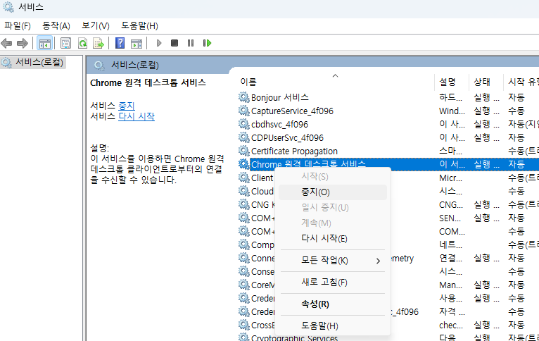 목록에서 'Chrome 원격 데스크톱 서비스' 를 찾아 중지시킨다.