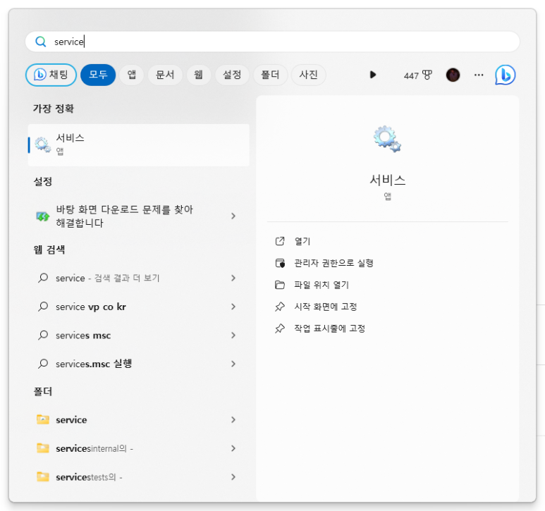 윈도우키를 눌러 service로 검색하고 service 앱을 실행한다.